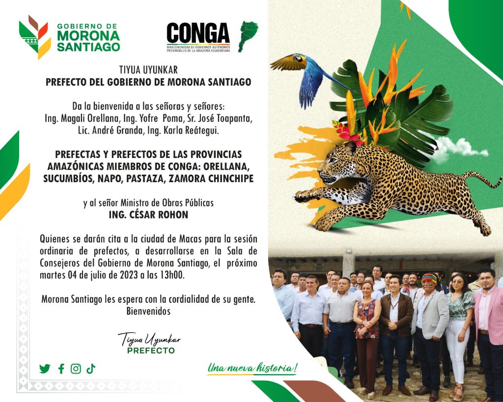 El ministro de Obras Públicas Ing. César Rohon participará de la sesión del directorio de la Mancomunidad de Gobiernos Autónomos Provinciales de la Amazonia Ecuatoriana – CONGA que se realizará en la ciudad de Macas el martes 04 de julio a las 13h00 en el salón de Consejeros del Gobierno de Morona Santiago. En esta sesión se procederá a la firma del convenio de Cooperación interinstitucional entre el MTOP y los Gobiernos Provinciales de la amazonía.